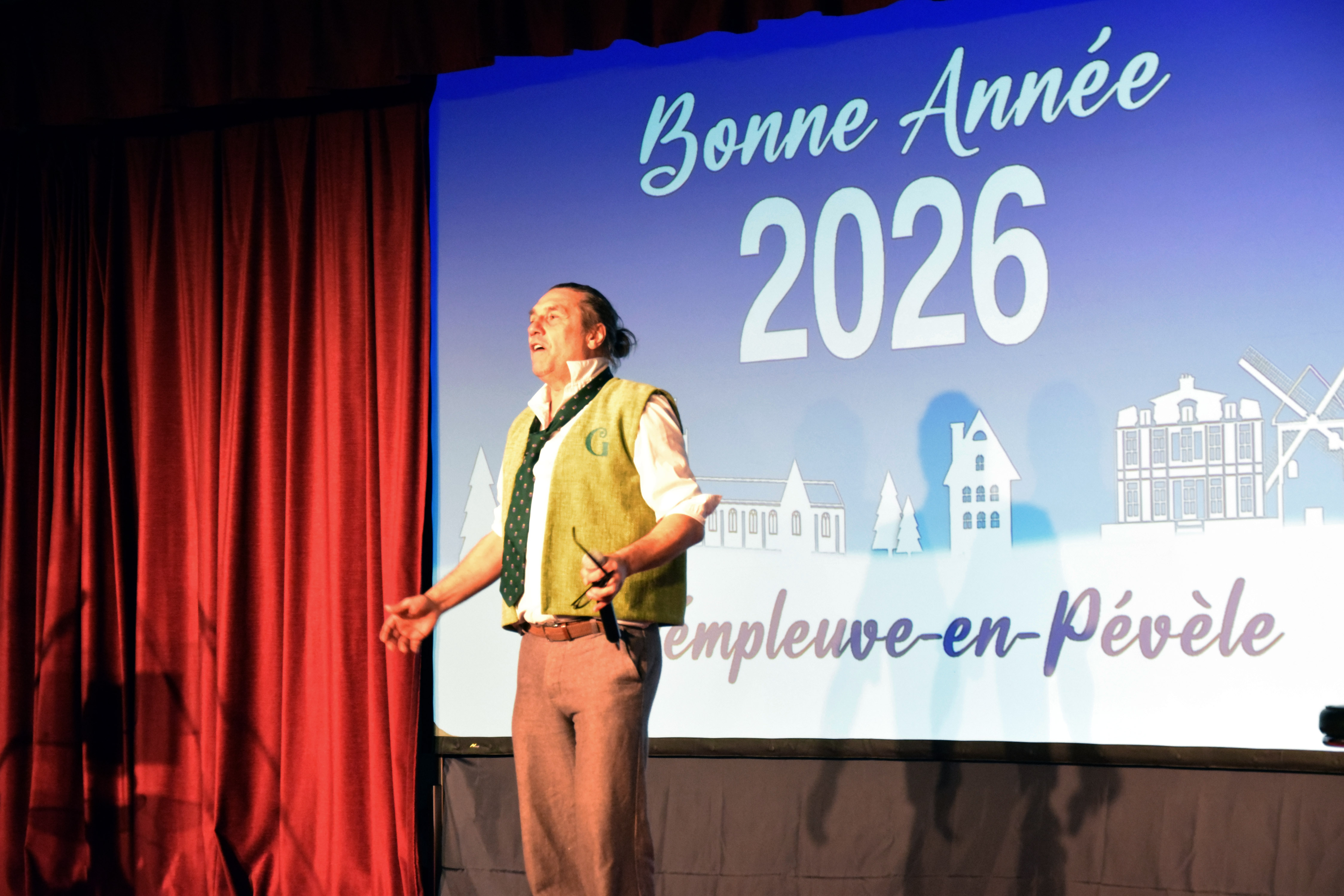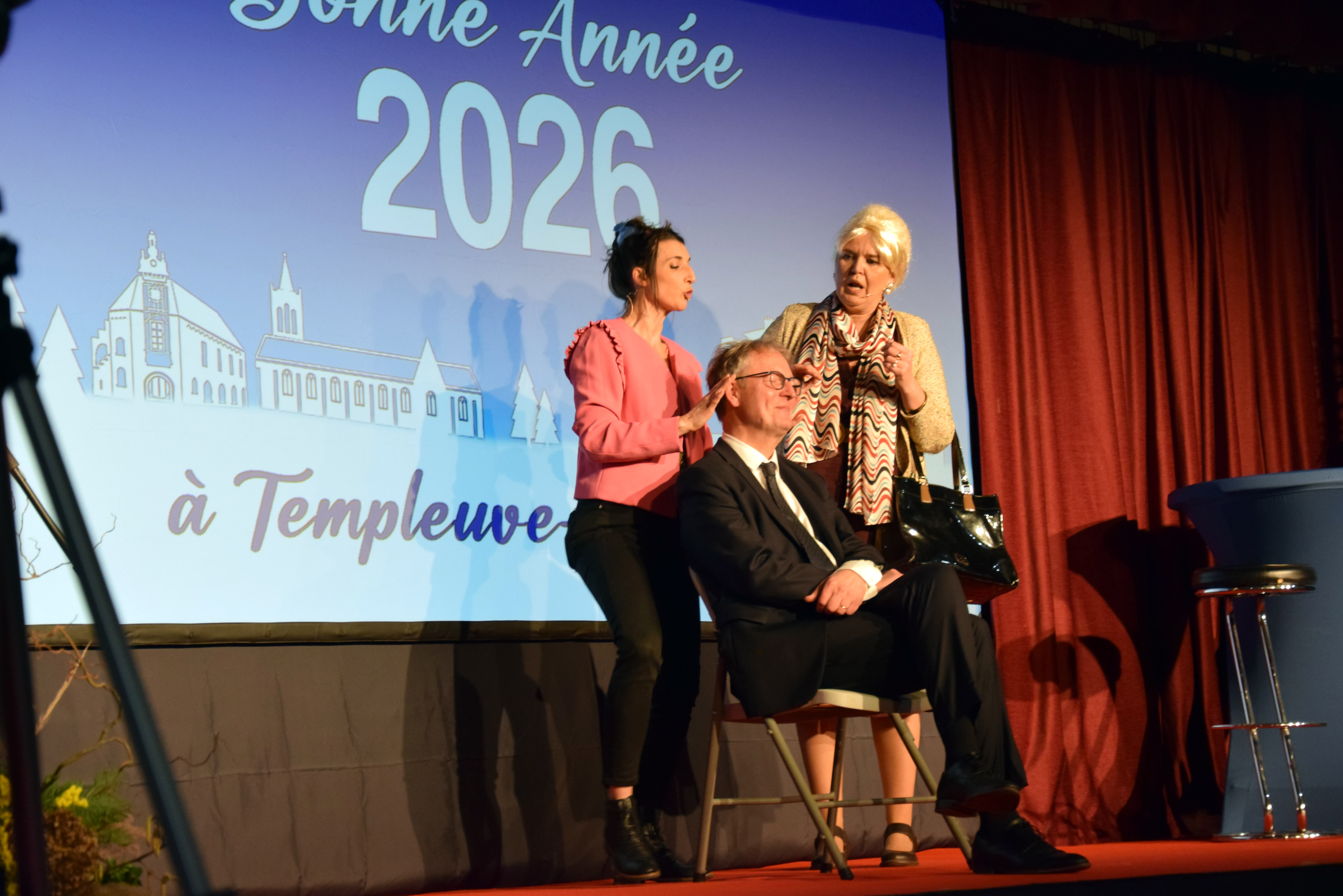 En effet, Luc Monnet, Maire et Joëlle Dupriez, sa première adjointe, présentaient les vœux aux Templeuvoises et Templeuvois pour la dernière fois puisqu’ils ont décidé de ne plus se représenter aux prochaines élections. Cette cérémonie orchestrée par Stéphane Van de Rosieren nous a fait passer un excellent moment. Les comédiens de la belle histoire ont joué avec humour le rôle du duo.